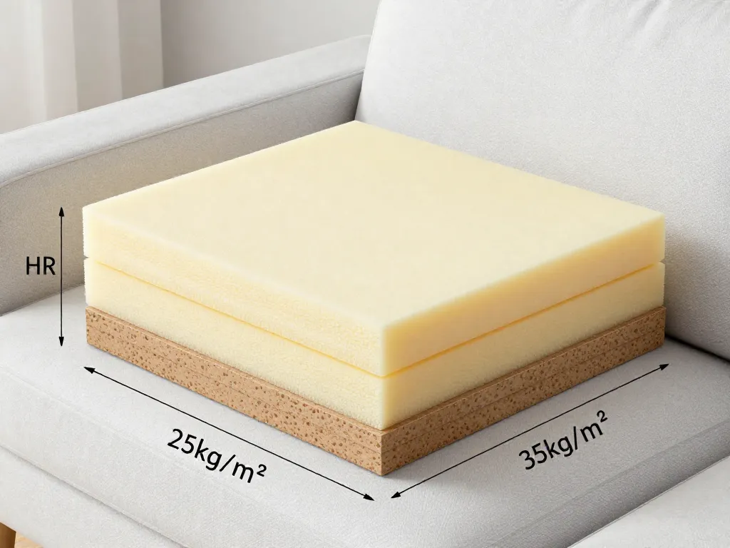 Pour une assise qui ne s'affaisse pas, optez pour une mousse Polyuréthane Haute Résilience (HR) d'une densité minimum 35 kg/m³. Pour le dossier, 25 kg/m³ suffit. En dessous de ces seuils, la mousse perdra son élasticité et son volume en moins de 3 ans.