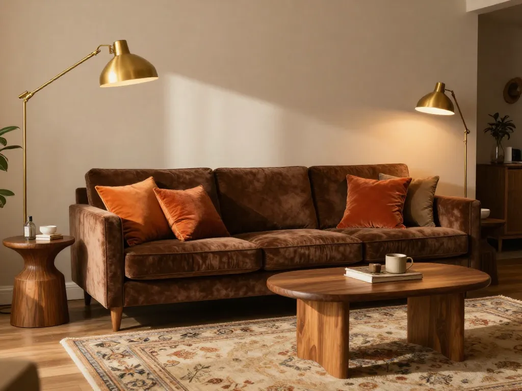 Le brun chocolat connaît une résurgence remarquable après des années de désaffection. Contrairement aux bruns rougeoyants d'autrefois, le brun chocolat 2025 tend vers des teintes plus claires – proche du cacao noir poudré plutôt que de l'écorce d'arbre. Sur un canapé en velours, cette teinte crée une ambiance à la fois cocooning et sophistiquée, fonctionnant merveilleusement bien avec des accessoires dorés ou des bois chauds.