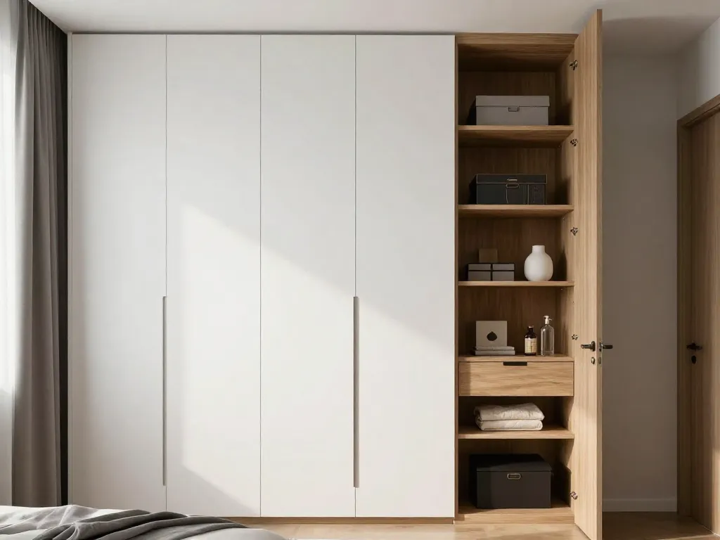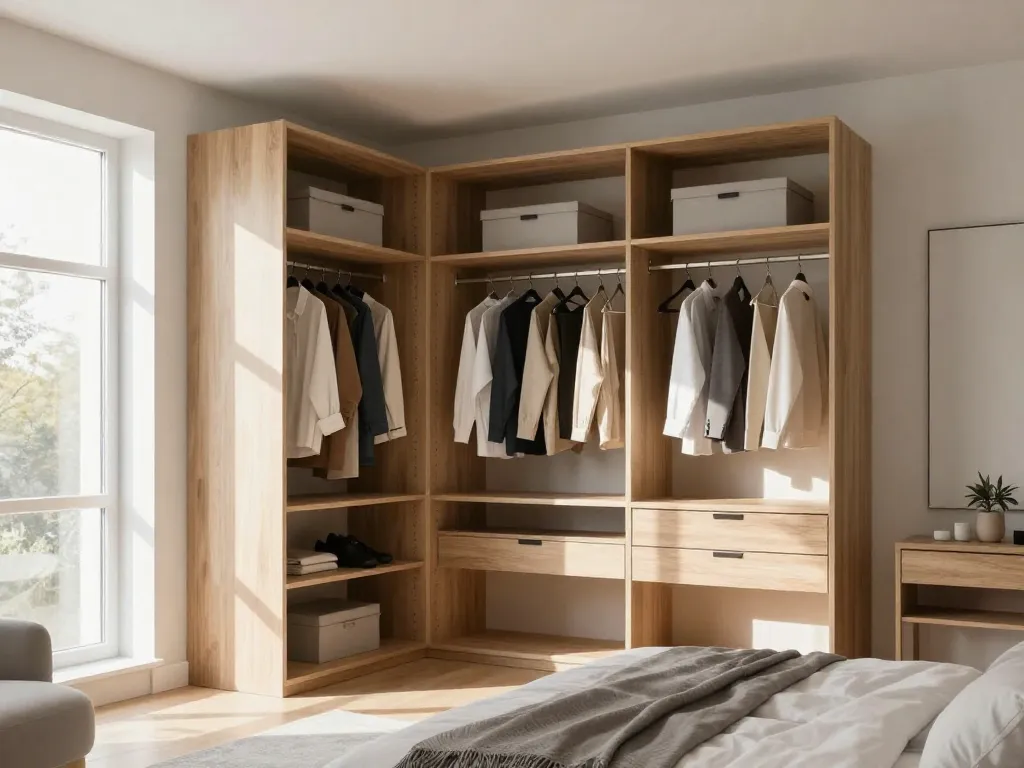 Dressing ouvert : Parfait pour les petites chambres ou les pièces à géométrie complexe (sous-pente, niche). Sans portes, vous gagnez en profondeur visuelle — l'espace semble plus grand. Plus besoin de dégagement pour ouvrir une porte battante.