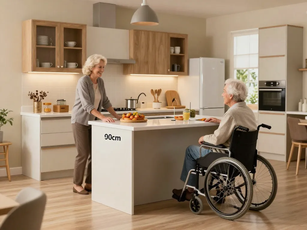 Si votre foyer comprend des personnes à mobilité réduite ou des seniors, la hauteur de 110 cm devient problématique. Privilégiez un îlot à 90 cm ou un plan rabaissé à 75 cm conforme aux normes d'accessibilité, permettant l'usage d'une chaise standard.