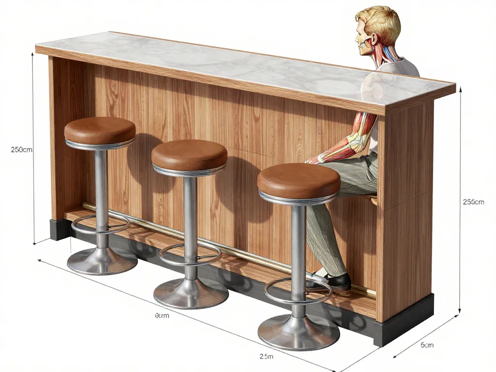Pour garantir une posture ergonomique et une bonne circulation sanguine, vous devez respecter un intervalle de 25 à 30 cm entre le dessus de l'assise du tabouret et le dessous du plateau. C'est la règle d'or des agenceurs professionnels.