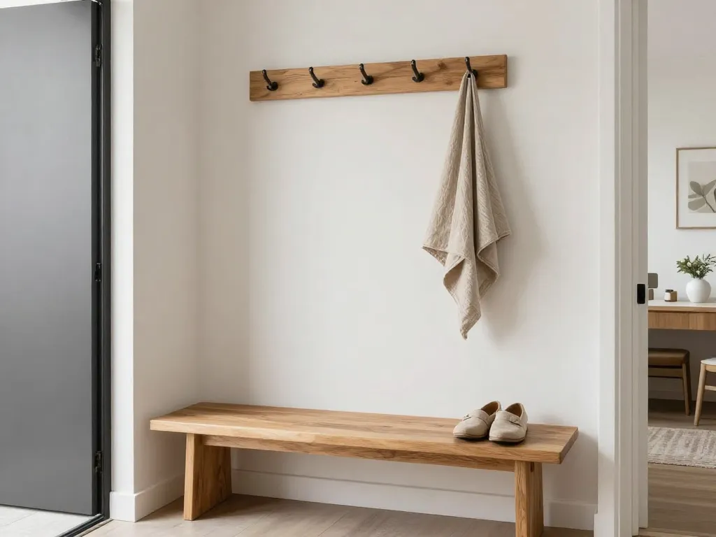 Patères murales robustes Privilégiez l'acier ou le bois massif fixé directement dans la structure (jamais collé). Ces solutions ne prennent aucune place au sol et offrent bien plus de stabilité que les portemanteaux classiques.