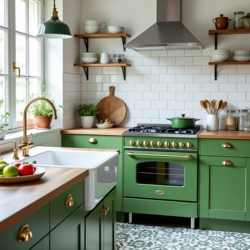 - Variante : murs vert sauge et meubles crème pour une cuisine “cottage chic”.
